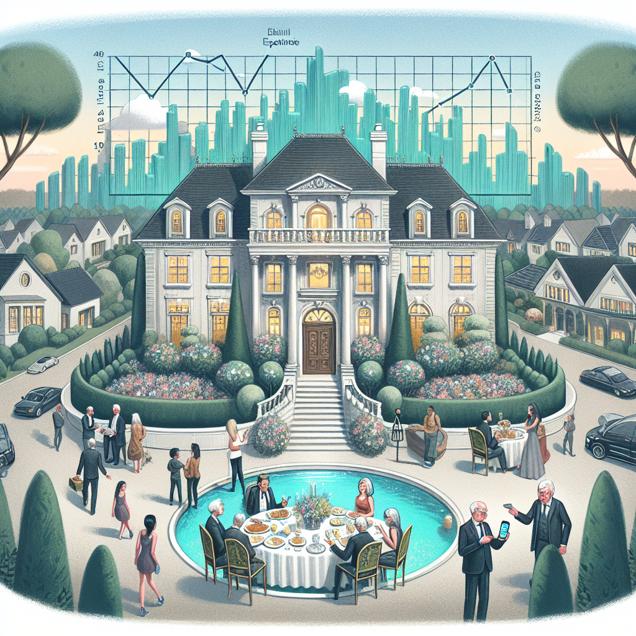 Prompt: Generate an image of a whimsical illustration featuring a grand, opulent mansion standing amidst a luxurious neighborhood. The mansion's impressive facade and sprawling grounds should be highlighted, conveying its elegance and upscale status. In the scene, a wealthy individual eagerly checks their smartphone at the entrance, capturing the dynamic stock price of CME Group. Inside the mansion, a lavish dinner party is in full swing, with guests engaged in discussions about their latest successful trades, contributing to the opulent atmosphere. Additionally, incorporate a subtle representation of increasing annual spending on housing by US households in the background, creating a sense of economic impact within the extravagant setting. The depiction should include only scenes, people, and objects, it should not include text or speech bubbles.