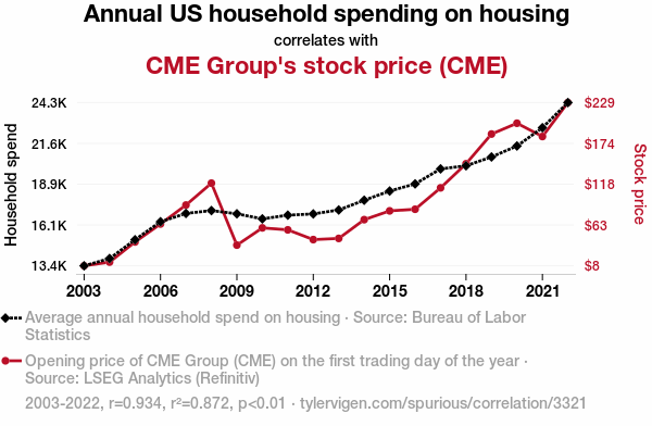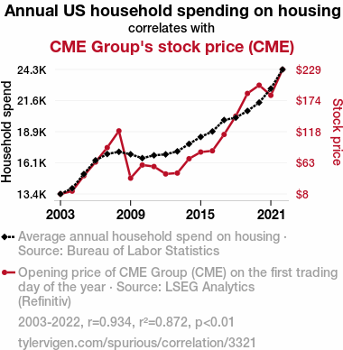User prompt: Please provide potential search keywords for a paper titled Housing Habits and CME: A Correlation Catastrophe? with an abstract of This research study investigates the entangled relationship between annual US household spending on housing and the stock price of CME Group. With a hefty dose of humor, we delve into the data from 2003 to 2022, sourced from the Bureau of Labor Statistics and LSEG Analytics (Refinitiv), to uncover the peculiar correlation. Our findings reveal a striking correlation coefficient of 0.9340040 with a p-value less than 0.01, prompting us to ponder whether CME's fortunes are hitched to the housing habits of the American populace. We explore this quirky correlation, inviting readers to chuckle as we uncover the surprising intersection of housing expenditures and CME's stock price.
