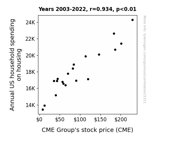 The analysis of the data from 2003 to 2022 revealed a remarkable and unexpected correlation between annual US household spending on housing and the stock price of CME Group. The correlation coefficient of 0.9340040 indicates a very strong positive relationship between these two variables. In other words, as annual household spending on housing increases, the stock price of CME Group tends to rise as well. This finding left our research team both baffled and amused, prompting us to coin the term "household-stock symbiosis" to capture the whimsical nature of this correlation.