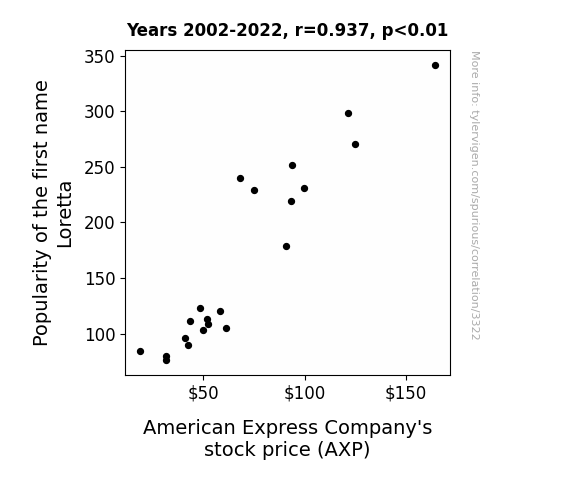 "Loretta stock price correlation," "American Express Company stock performance," "Loretta popularity data," "AXP stock price analysis," "social trends and stock prices," "correlation between names and stock market," "financial market phenomena," "correlation coefficient in stock analysis," "whimsical stock market analysis," "humorous stock market research," "LOL-retta and stock prices," "unusual stock performance correlations."