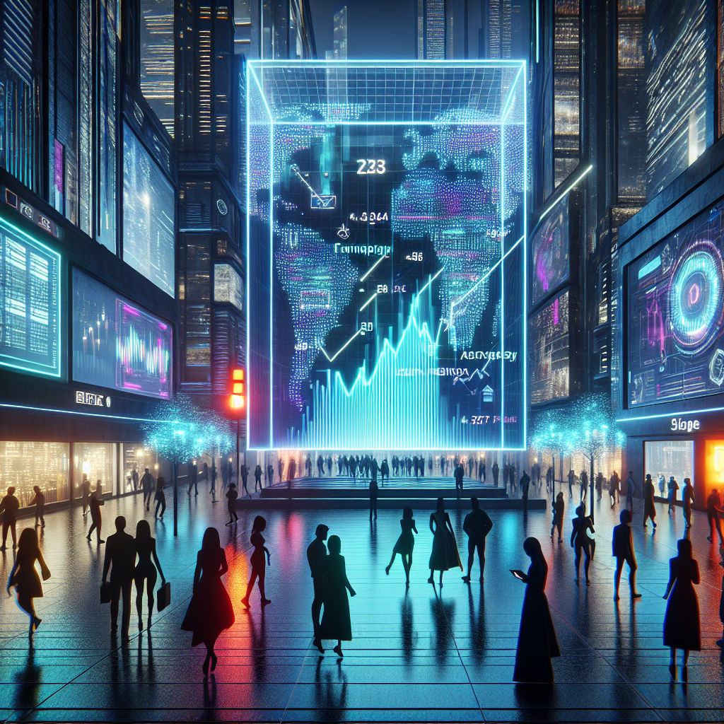 Prompt: Generate an image of a cyberpunk city street with towering skyscrapers that cast dark shadows onto the neon-lit pavement. In the center of the scene, a large holographic billboard prominently displays the rapidly climbing stock price of Ameriprise Financial (AMP), capturing the attention of the passersby with its glowing numbers and charts. Meanwhile, a group of sharply dressed parents engage in a lively conversation, their holographic silhouettes discussing the growing trend of naming children Ruth, symbolizing wisdom and strength. The positive energy of the city street is palpable as the popularity of the name Ruth aligns with the confidence and optimism reflected in the surging stock prices on the billboard. The depiction should include only scenes, people, and objects, it should not include text or speech bubbles.