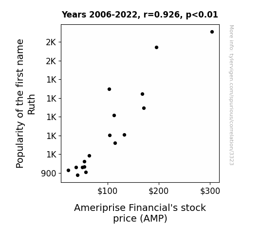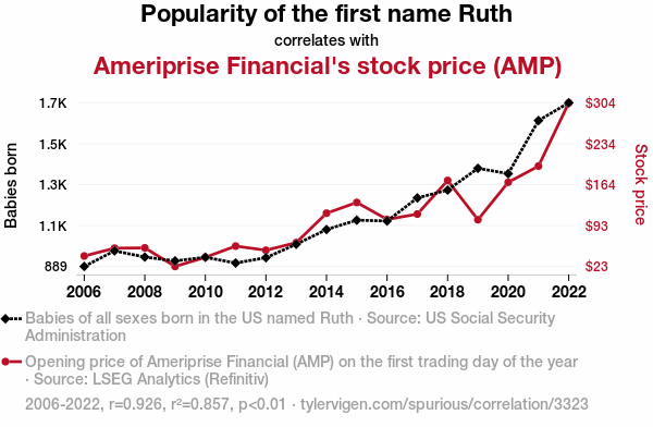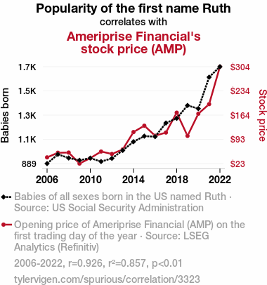 - The spurious research paper: The AMPle Effect of Ruth: A Quantitative Examination of the Correlation between the Popularity of the First Name Ruth and Ameriprise Financial's Stock Price