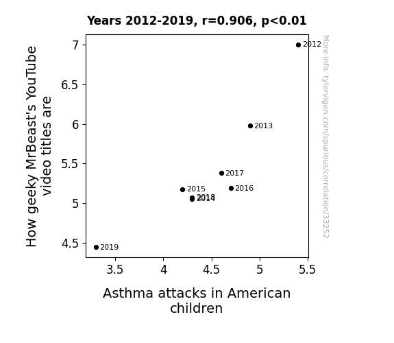This means 82.1% of the change in the one variable (i.e., Asthma attacks in American children) is predictable based on the change in the other (i.e., How geeky MrBeast's YouTube video titles are) over the 8 years from 2012 through 2019.
