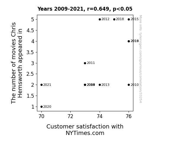 This means 42.1% of the change in the one variable (i.e., Customer satisfaction with NYTimes.com) is predictable based on the change in the other (i.e., The number of movies Chris Hemsworth appeared in) over the 13 years from 2009 through 2021.