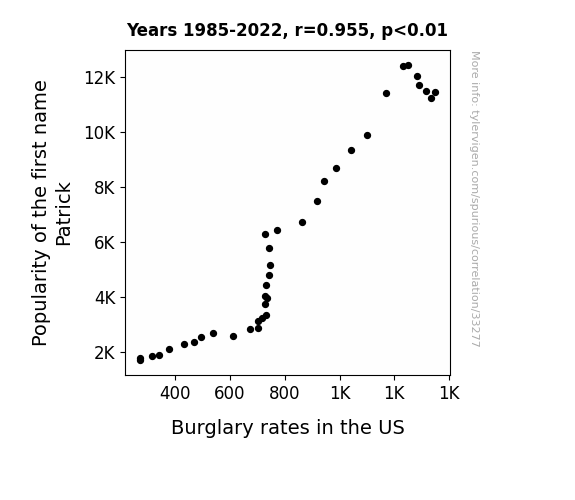 This means 91.2% of the change in the one variable (i.e., Burglary rates in the US) is predictable based on the change in the other (i.e., Popularity of the first name Patrick) over the 38 years from 1985 through 2022.