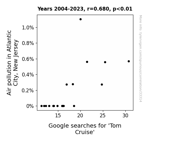 This means 46.3% of the change in the one variable (i.e., Google searches for 'Tom Cruise') is predictable based on the change in the other (i.e., Air pollution in Atlantic City, New Jersey) over the 20 years from 2004 through 2023.