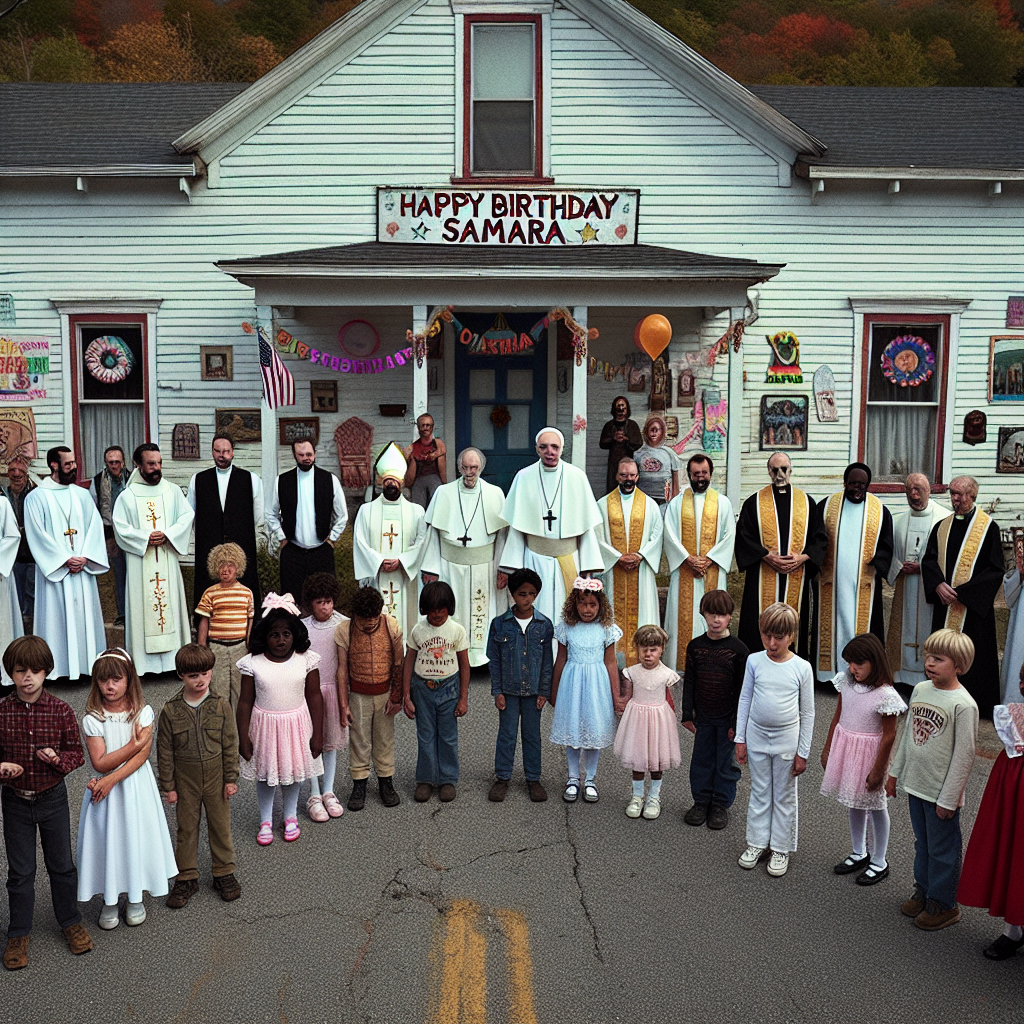 Prompt: Certainly! Here's an improved image generation prompt that'll likely produce an intriguing visual: Generate an image in the style of a TIME magazine cover, depicting a striking scene in a small town in West Virginia. In the foreground, there's a line of clergy members in their traditional robes and collars, solemnly gathered outside a cozy school building. The building prominently displays a sign that reads "Happy Birthday Samara" in festive decorations. Meanwhile, lively children in various costumes are seen playing games and laughing nearby, adding a sense of cheerful innocence to the scene. In the background, a few concerned parents engage in anxious conversations with the clergy members, hinting at the underlying tension and anticipation for a sudden surge in exorcisms. The visual presentation should be simple yet captivating, capturing the intriguing juxtaposition of the joyful birthday celebration and the solemn preparations for spiritual rituals. The depiction should include only scenes, people, and objects, it should not include text or speech bubbles.