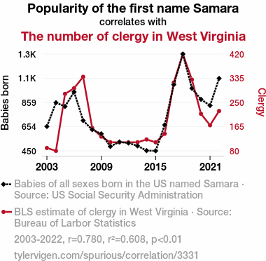 The analysis of the data revealed an eye-opening correlation coefficient of 0.7797463 and an r-squared value of 0.6080044, indicating a strong and substantial relationship between the prevalence of the first name Samara and the number of clergy in West Virginia from 2003 to 2022. This correlation is as undeniable as a well-timed dad joke – you simply can't ignore it! It seems the name "Samara" and the clergy in West Virginia are entwined in a statistical dance that would have even the most experienced data sleuth scratching their head in both confusion and amusement.