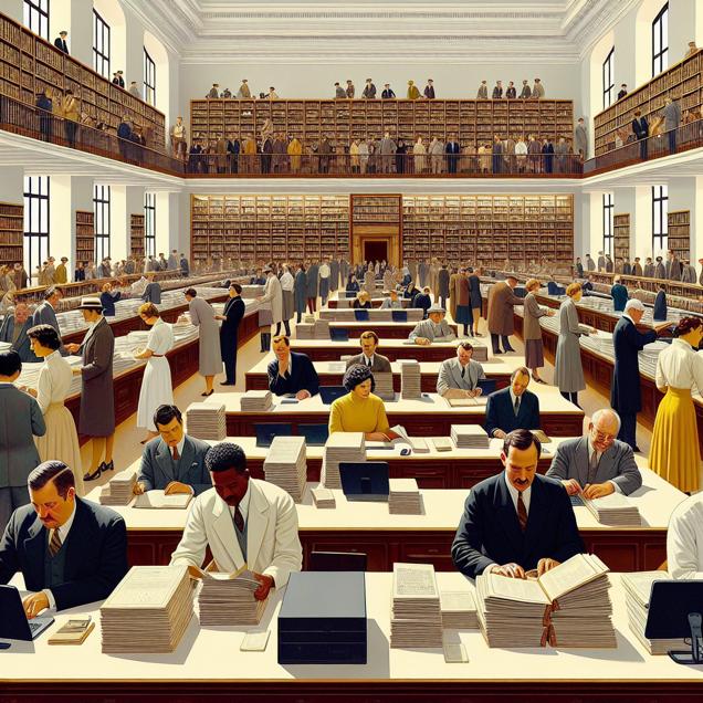 ChatGPT: Generate an image of a spacious library in South Carolina. In the foreground, there are rows of archivists carefully organizing shelves filled with various records and documents. In the background, a group of curious visitors gathers around a computer, pleasantly engrossed in their search. The scene presents a juxtaposition of diligent work and modern curiosity, capturing the essence of the library's evolving role as a destination for exploring the archives of "suspicious" activity. The minimalism of the image emphasizes the contrast between the traditional library atmosphere and the contemporary interests of its visitors.