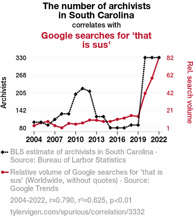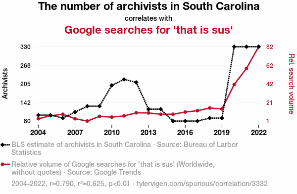 Archivist presence, South Carolina archivists, Google searches, "that is sus", correlation analysis, coefficient, p-value, statistical significance, archivists and "that is sus", quirky correlations, peculiar correlations, society sleuths, quirky correlations in literature.