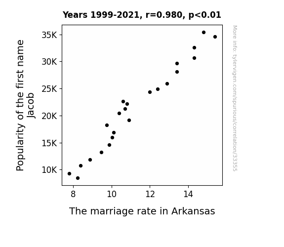 This means 96.1% of the change in the one variable (i.e., The marriage rate in Arkansas) is predictable based on the change in the other (i.e., Popularity of the first name Jacob) over the 23 years from 1999 through 2021.