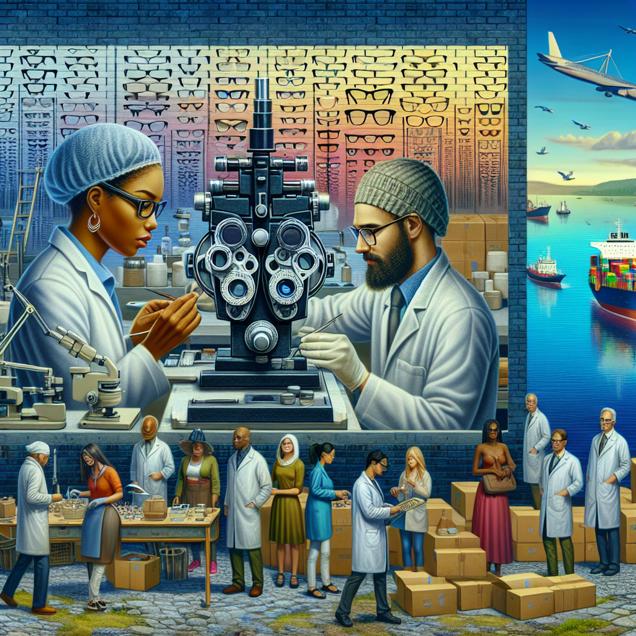 User prompt: Please describe a visual scene that prominently depicts both The number of ophthalmic laboratory technicians in New Hampshire and Petroluem consumption in Solomon Islands, in the following situation: Because as ophthalmic lab techs in New Hampshire increase, more people wear glasses, creating an international fad. This leads to increased shipping, causing more vehicle use and petrol consumption in the Solomon Islands.. Keep the description simple.
