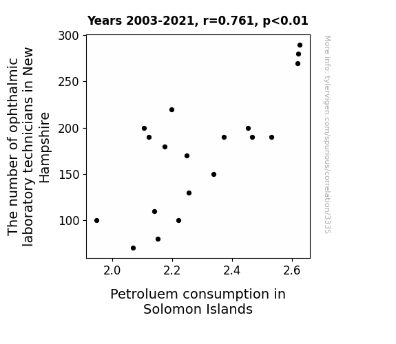 - The spurious research paper: Seeing Clearly: The Correlation Between Ophthalmic Laboratory Technicians in New Hampshire and Petroleum Consumption in the Solomon Islands