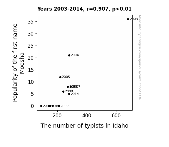 The results of our study revealed a strong positive correlation between the popularity of the first name "Moesha" and the number of typists in the state of Idaho during the period from 2003 to 2014. The correlation coefficient of 0.9070312 indicates a robust relationship between these seemingly disparate variables, with an r-squared value of 0.8227055, and a p-value less than 0.01, providing statistical support for the significance of the association. It seems that the impact of the name "Moesha" extends far beyond its linguistic resonance and resonates with the labor dynamics of Idaho in a "type"-ical fashion.