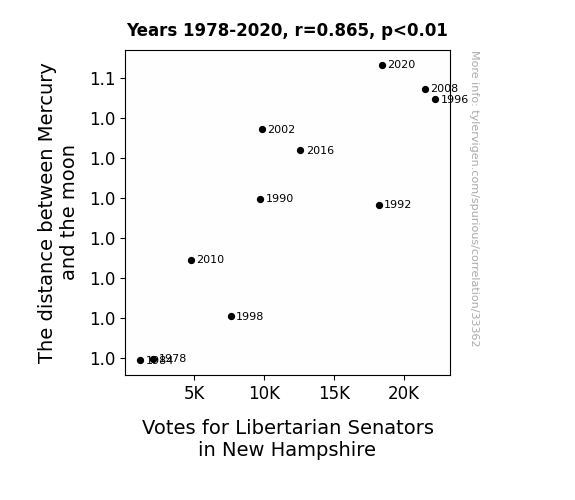 This means 74.8% of the change in the one variable (i.e., Votes for Libertarian Senators in New Hampshire) is predictable based on the change in the other (i.e., The distance between Mercury and the moon) over the 11 years from 1978 through 2020.