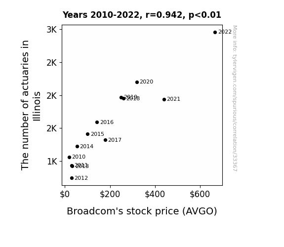 This means 88.7% of the change in the one variable (i.e., Broadcom's stock price (AVGO)) is predictable based on the change in the other (i.e., The number of actuaries in Illinois) over the 13 years from 2010 through 2022.