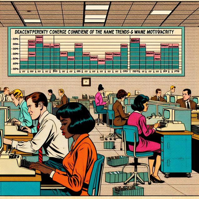 ChatGPT: Generate a comic-book-style illustration with muted colors and a dotted halftone pattern from the 1960s depicting a bustling Idaho office. The scene reveals typists at their desks working with diminishing energy, as the sound of clacking keyboards gradually fades. Meanwhile, a chart on the wall displays the declining popularity of the first name Moesha, reflecting the waning inspiration in the room. The link between the two is evident, as the lack of "Moesha-typed" motivation seems to have slowed down the once-speedy typists. The image should capture the nostalgic and whimsical essence of a 1960s comic book illustration while emphasizing the office environment and the connection between the name trend and the typists' energy.