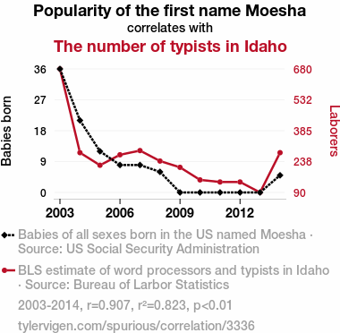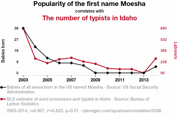 - The spurious research paper: The Moesha Mania and Typist Triumph: A Statistical Study of Name Popularity and Office Occupations in Idaho