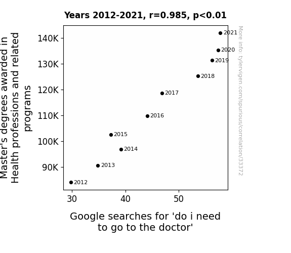This means 97.1% of the change in the one variable (i.e., Google searches for 'do i need to go to the doctor') is predictable based on the change in the other (i.e., Master's degrees awarded in Health professions and related programs) over the 10 years from 2012 through 2021.