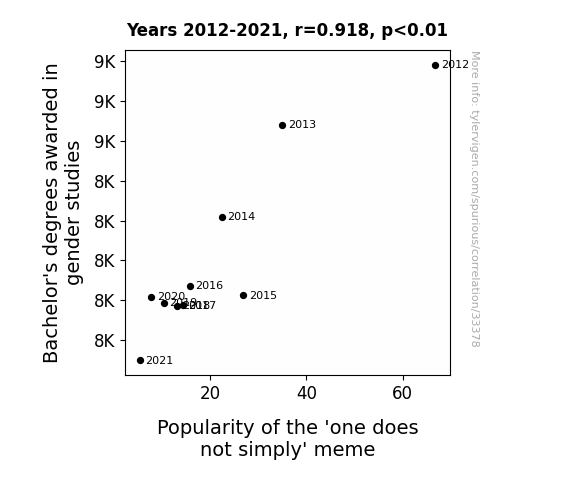 This means 84.3% of the change in the one variable (i.e., Popularity of the 'one does not simply' meme) is predictable based on the change in the other (i.e., Bachelor's degrees awarded in gender studies) over the 10 years from 2012 through 2021.