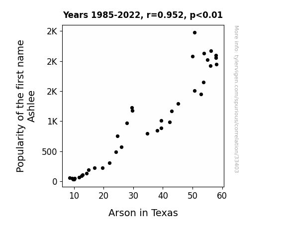 This means 90.6% of the change in the one variable (i.e., Arson in Texas) is predictable based on the change in the other (i.e., Popularity of the first name Ashlee) over the 38 years from 1985 through 2022.