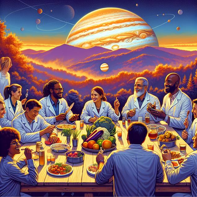 ChatGPT: The High-tech scene depicts a group of food scientists and technologists gathered around a table in the North Carolina mountains. The warm glow of the sunset bathes their faces as they excitedly brainstorm and experiment with fresh local produce. The sky is dominated by the sight of Jupiter, slightly brighter and closer than usual, casting a captivating aura above the horizon. The giant planet's proximity seems to inspire the team as they work on creating innovative dishes, their spirits lifted by the celestial influence.