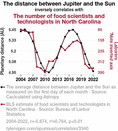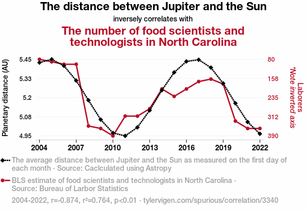 User prompt: Please provide potential search keywords for a paper titled Pie in the Sky: The Astronomical Relationship Between Jupiter's Distance and North Carolina's Food Scientists with an abstract of In our study, we aimed to shed light on a curious correlation that has eluded researchers for far too long: the connection between the distance of Jupiter from the Sun and the number of food scientists and technologists in North Carolina. After laboring through data from Astropy and the Bureau of Labor Statistics, we were able to quantify this celestial tie to the culinary world. Our findings revealed a robust negative correlation, with a correlation coefficient of -0.8738514, and a statistically significant p-value of less than 0.01 for the years spanning 2004 to 2022.