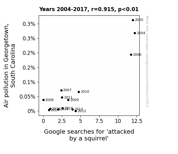 This means 83.7% of the change in the one variable (i.e., Google searches for 'attacked by a squirrel') is predictable based on the change in the other (i.e., Air pollution in Georgetown, South Carolina) over the 14 years from 2004 through 2017.