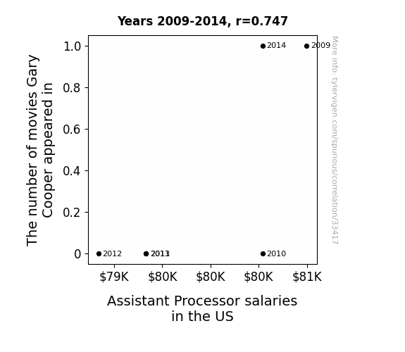 This means 55.7% of the change in the one variable (i.e., Assistant Processor salaries in the US) is predictable based on the change in the other (i.e., The number of movies Gary Cooper appeared in) over the 6 years from 2009 through 2014.