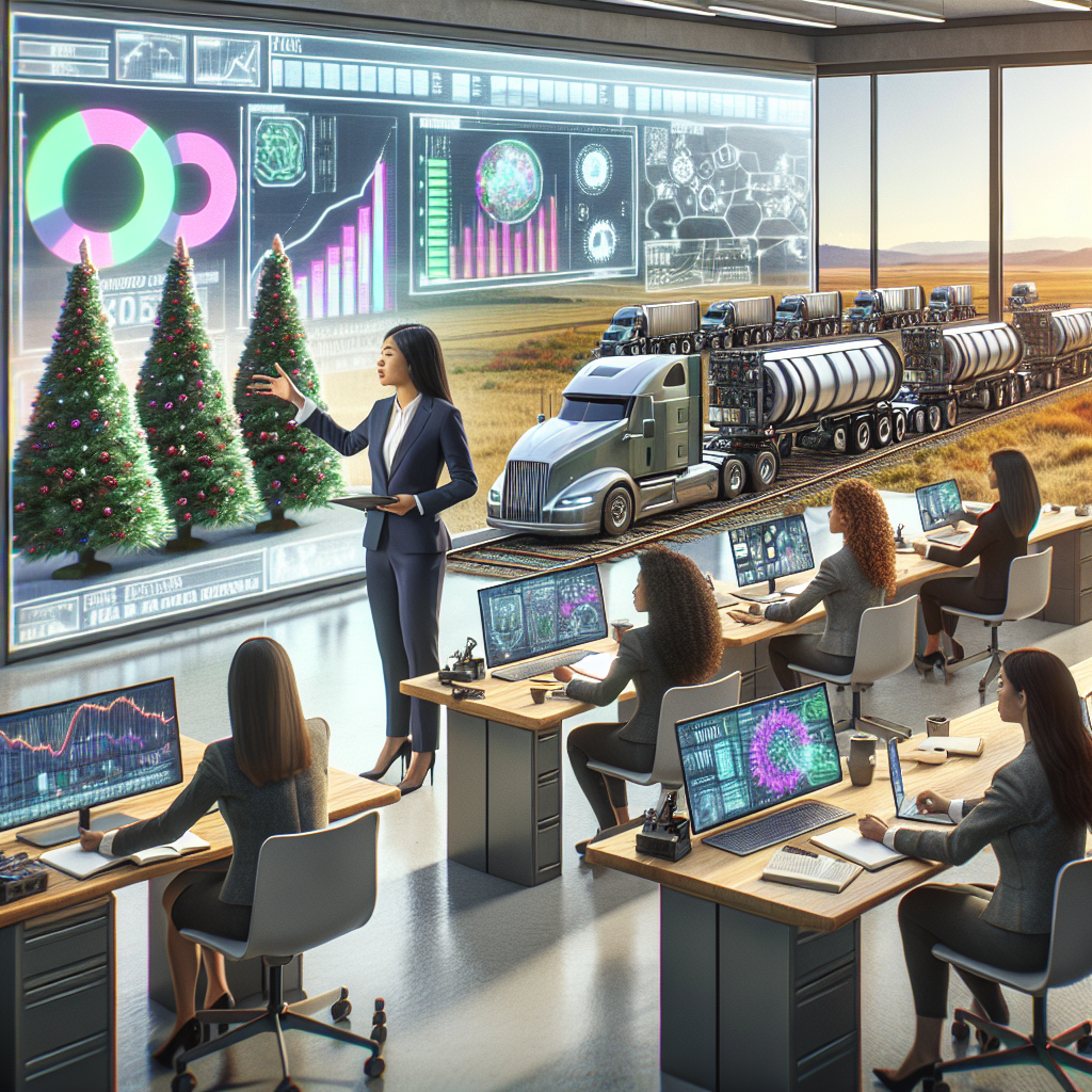 User prompt: Please respond with an image generation prompt that would be likely to create an interesting visual using DALLE-3, using the following style: [ Futuristic ] and depicting this scene: In Idaho, a handful of university economics teachers are seen leading a classroom discussion on supply and demand, while outside, a line of trucks is shown carrying artificial Christmas trees to be shipped out across the US. Keep the visual depiction simple. Do not include any words or speech bubbles.
