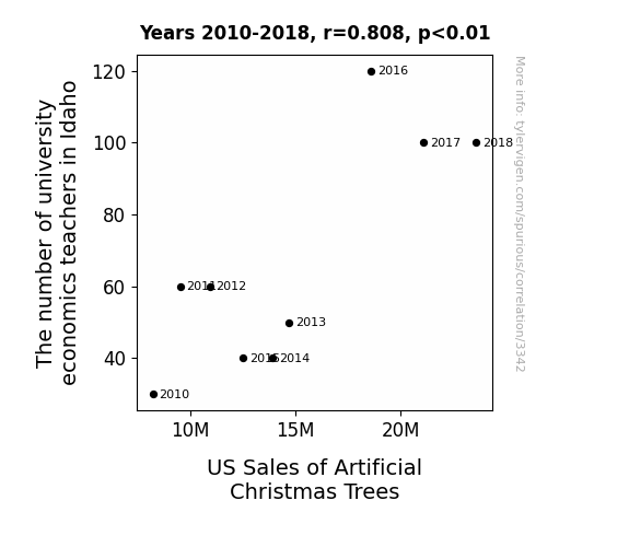 The results of our analysis reveal a remarkably robust correlation between the number of university economics teachers in Idaho and US sales of artificial Christmas trees from 2010 to 2018. The correlation coefficient of 0.8079661 indicates a strong positive relationship, suggesting that the presence of economics teachers may indeed have a considerable impact on the demand for artificial foliage during the festive season. It appears that the influence of these educators extends beyond the classroom and ventures into the jolly realm of holiday consumerism.