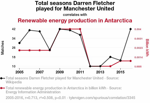 This means 50.8% of the change in the one variable (i.e., Renewable energy production in Antarctica) is predictable based on the change in the other (i.e., Total seasons Darren Fletcher played for Manchester United) over the 12 years from 2005 through 2016.