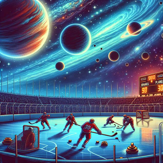 User prompt: Please describe a visual scene that prominently depicts both The distance between Uranus and Venus and Number of games won by Detroit Red Wings in NHL season, in the following situation: Because the increase in the distance between Uranus and Venus created a cosmic alignment that boosted the Red Wings' puck-handling skills and made their opponents slip on intergalactic banana peels, leading to more wins in the NHL season.. Keep the description simple.