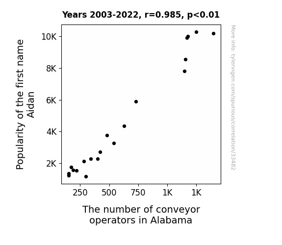This means 97% of the change in the one variable (i.e., The number of conveyor operators in Alabama) is predictable based on the change in the other (i.e., Popularity of the first name Aidan) over the 20 years from 2003 through 2022.