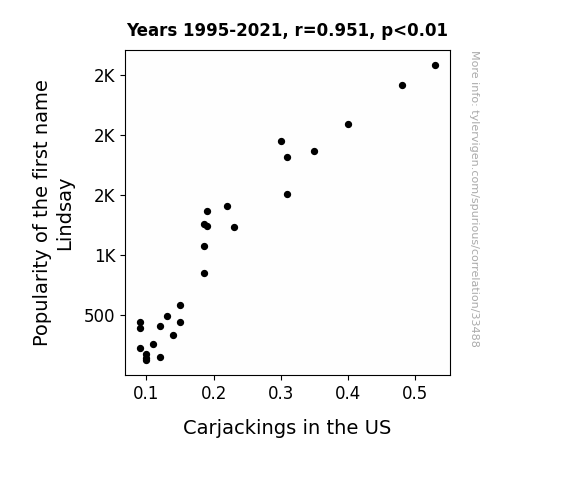 This means 90.4% of the change in the one variable (i.e., Carjackings in the US) is predictable based on the change in the other (i.e., Popularity of the first name Lindsay) over the 27 years from 1995 through 2021.