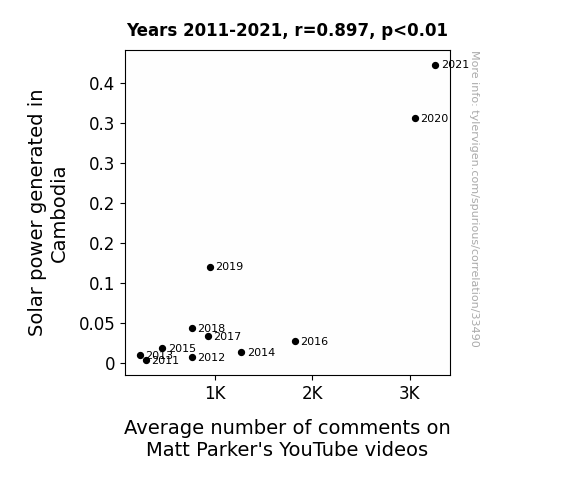 This means 80.5% of the change in the one variable (i.e., Average number of comments on Matt Parker's YouTube videos) is predictable based on the change in the other (i.e., Solar power generated in Cambodia) over the 11 years from 2011 through 2021.