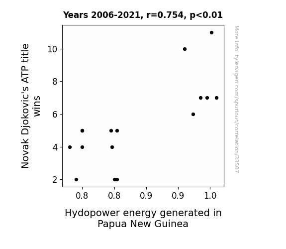 This means 56.8% of the change in the one variable (i.e., Hydopower energy generated in Papua New Guinea) is predictable based on the change in the other (i.e., Novak Djokovic's ATP title wins) over the 16 years from 2006 through 2021.
