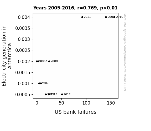 This means 59.2% of the change in the one variable (i.e., US bank failures) is predictable based on the change in the other (i.e., Electricity generation in Antarctica) over the 12 years from 2005 through 2016.
