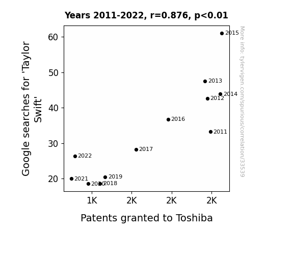 This means 76.8% of the change in the one variable (i.e., Patents granted to Toshiba) is predictable based on the change in the other (i.e., Google searches for 'Taylor Swift') over the 12 years from 2011 through 2022.