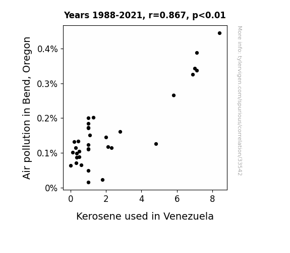 This means 75.1% of the change in the one variable (i.e., Kerosene used in Venezuela) is predictable based on the change in the other (i.e., Air pollution in Bend, Oregon) over the 34 years from 1988 through 2021.
