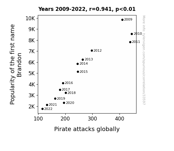 This means 88.6% of the change in the one variable (i.e., Pirate attacks globally) is predictable based on the change in the other (i.e., Popularity of the first name Brandon) over the 14 years from 2009 through 2022.