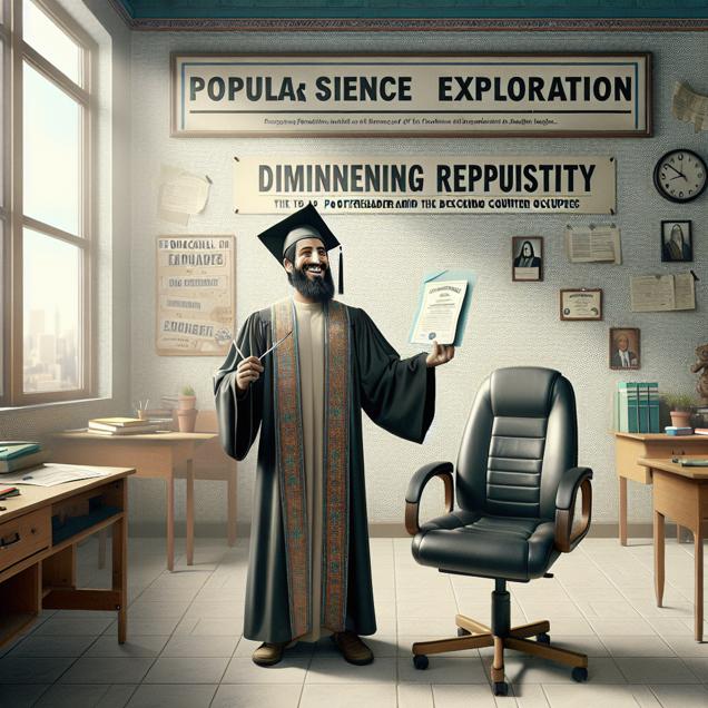 User prompt: Please respond with an image generation prompt that would be likely to create an interesting visual using DALLE-3, using the following style: [ A Discovery magazine cover image ] and depicting this scene: In a quiet classroom, a teacher proudly presents a Bachelor's degree in Education, and on the wall, there's a decreasing number of proofreader positions available in Kansas. The empty desks for proofreaders symbolize the declining demand as the number of educators decreases, leading to fewer opportunities for proofreading. Keep the visual depiction simple. Do not include any words or speech bubbles.