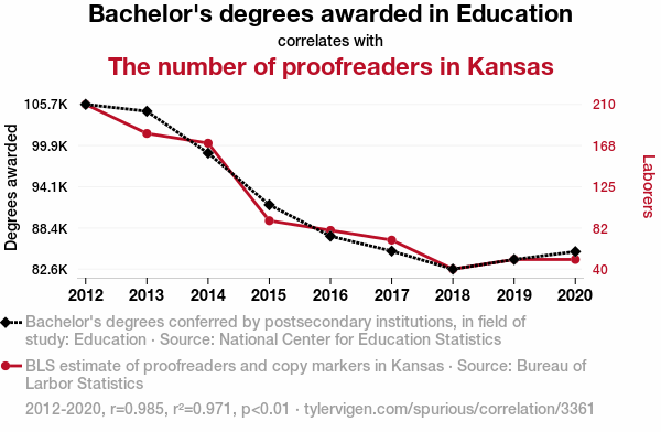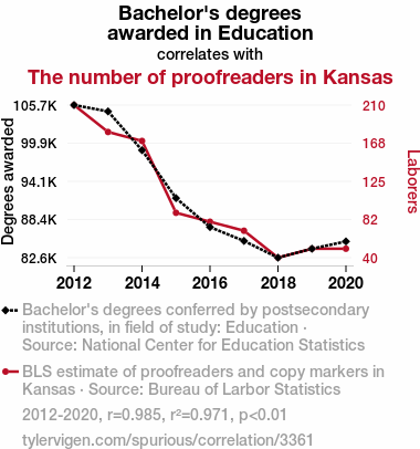 education bachelor's degrees, proofreaders, Kansas, correlation, National Center for Education Statistics, Bureau of Labor Statistics, statistical analysis, relationship, data analysis, higher education trends