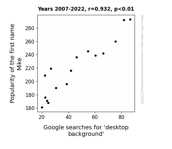 This means 86.9% of the change in the one variable (i.e., Google searches for 'desktop background') is predictable based on the change in the other (i.e., Popularity of the first name Mike) over the 16 years from 2007 through 2022.