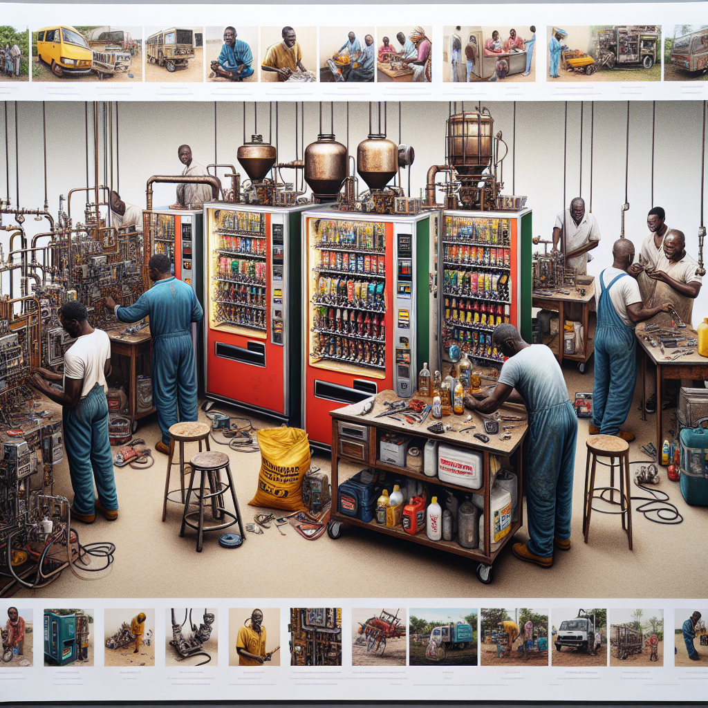 User prompt: Please respond with an image generation prompt that would be likely to create an interesting visual using DALLE-3, using the following style: [ A photo-realistic image ] and depicting this scene: In New Hampshire, a group of vending machine repairers is skillfully transforming broken vending machines into kerosene distillation units. The repairers are working diligently in a workshop, surrounded by tools and equipment. Meanwhile, in Guinea, the demand for kerosene is visibly decreasing, with fewer people purchasing it from local vendors. The scenes show the link between the ingenuity of the repairers and the impact it has on the use of kerosene in Guinea. Keep the visual depiction simple. Do not include any words or speech bubbles.
