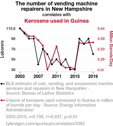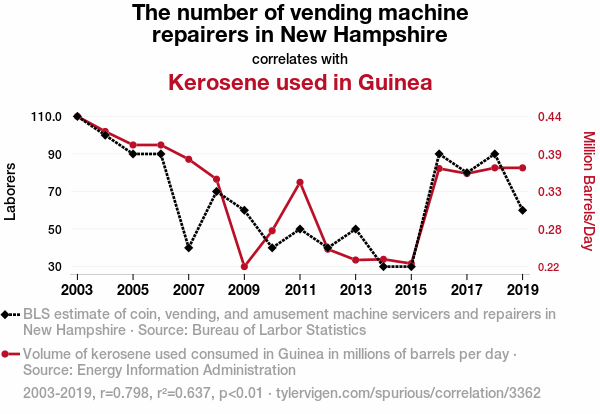 vending machine repairers, New Hampshire, kerosene consumption, Guinea, correlation, statistics, Bureau of Labor Statistics, Energy Information Administration