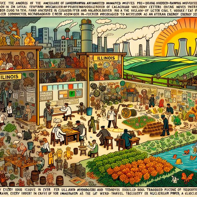 ChatGPT: "Generate an image that looks like it is a scene from a Pixar movie, depicting a laboratory in Illinois with fewer microbiologists and bacterial cultures, leading to a scene in Iran where nuclear power generation is being utilized as an alternative source of energy. Ensure the illustration is colorful and clearly portrays the transition from the laboratory to the nuclear power generation facility."