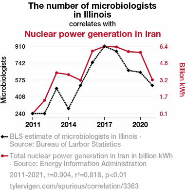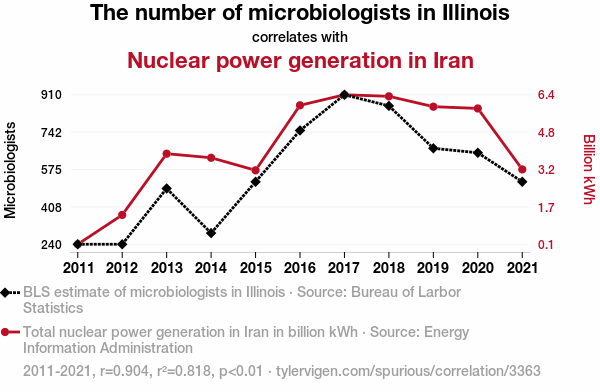 microbiologists, nukes, Illinois, Iran, nuclear power generation, correlation coefficient, statistical analysis, data analysis, Bureau of Labor Statistics, Energy Information Administration, hidden ties, microbial world, atomic science