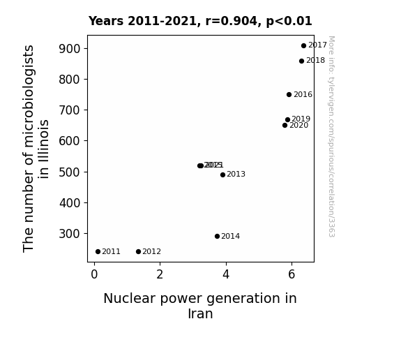 The moment of truth has arrived! Our data analysis has unearthed a remarkable correlation between the number of microbiologists in Illinois and nuclear power generation in Iran for the period spanning 2011 to 2021. With a dazzling correlation coefficient of 0.9042304 and an r-squared value of 0.8176326, the strength of this relationship is nothing short of electrifying! Our p-value of less than 0.01 further solidifies the significance of this unexpected association.