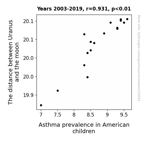 This means 86.7% of the change in the one variable (i.e., Asthma prevalence in American children) is predictable based on the change in the other (i.e., The distance between Uranus and the moon) over the 17 years from 2003 through 2019.